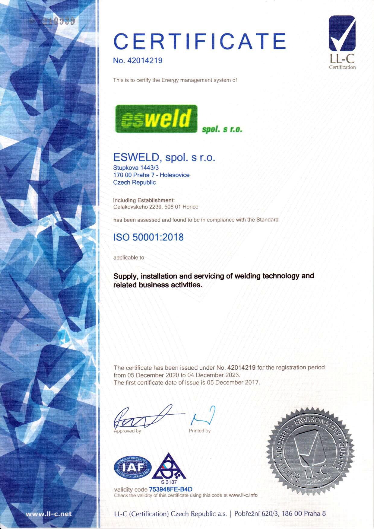 Certificate ISO 50001 Esweld spol. s r.o.