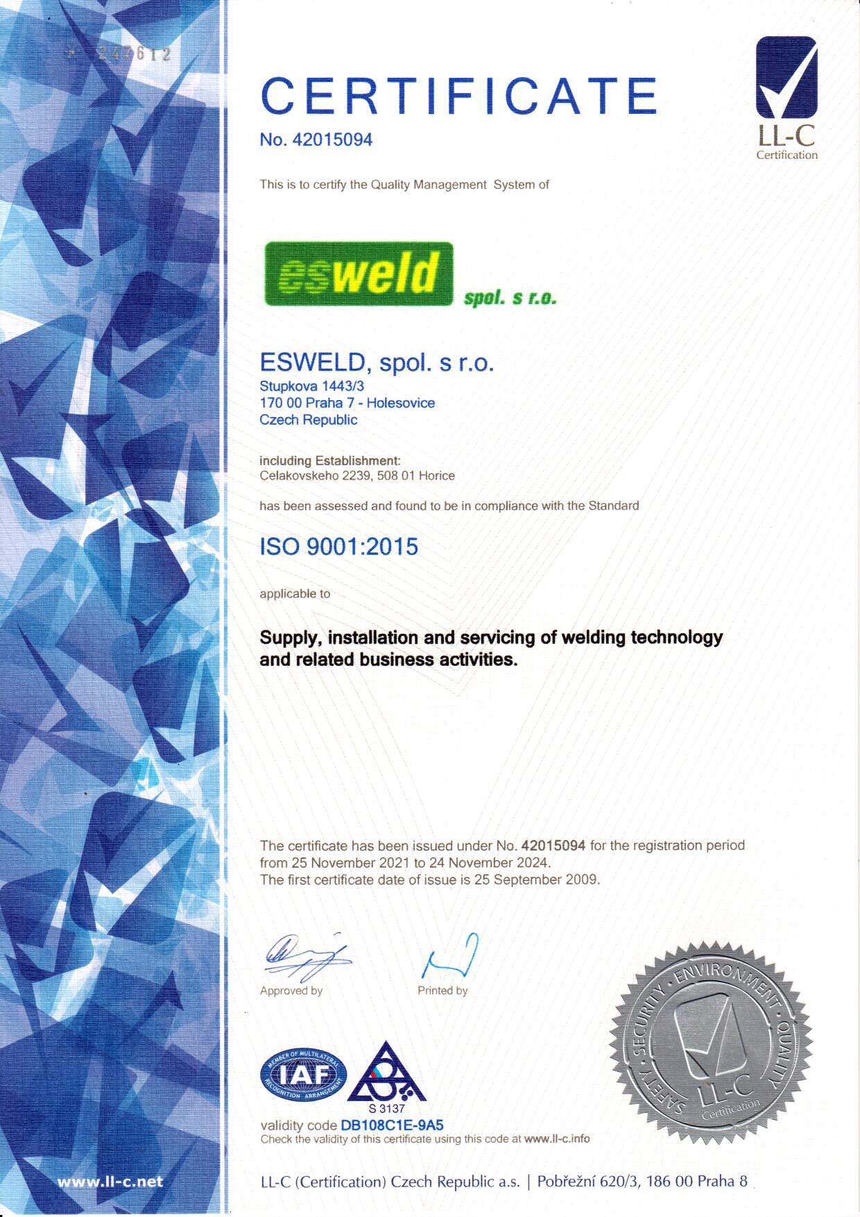 Certificate ISO 9001 Esweld spol. s r.o.